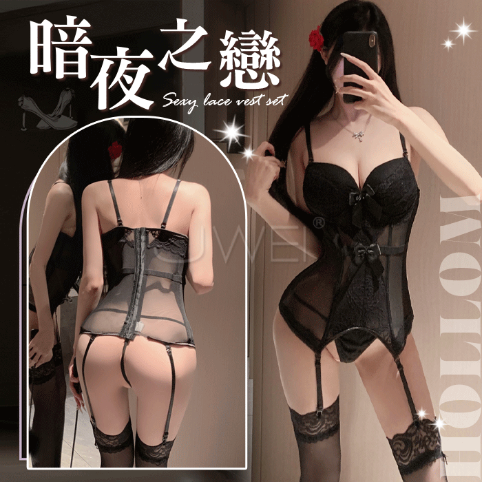 暗夜之戀.性感蕾絲深V棉墊鋼托透視馬甲吊襪帶套裝-黑色【吊帶馬甲+T褲+吊襪帶】