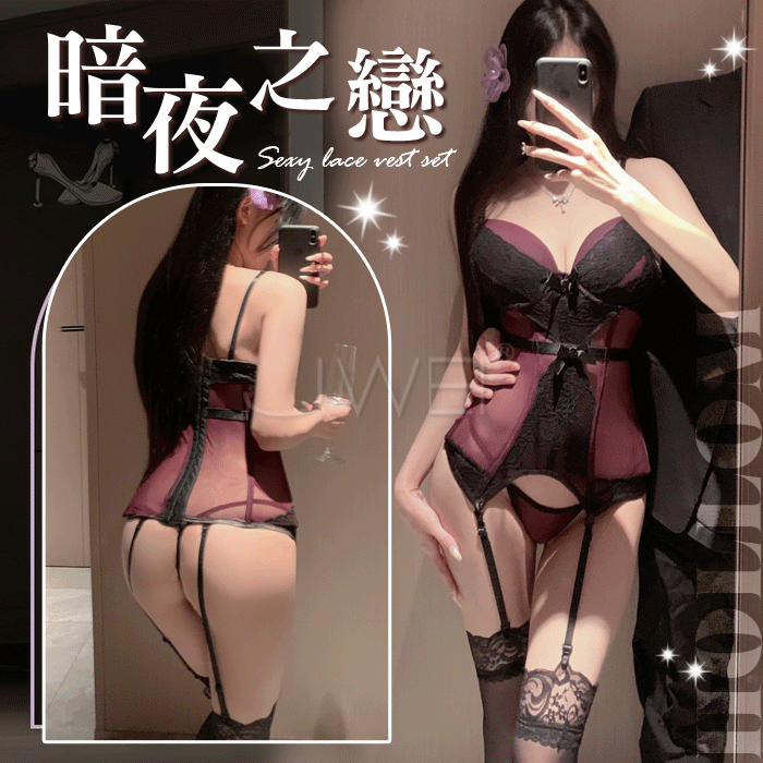 暗夜之戀.性感蕾絲深V棉墊鋼托透視馬甲吊襪帶套裝-紫色【吊帶馬甲+T褲+吊襪帶】