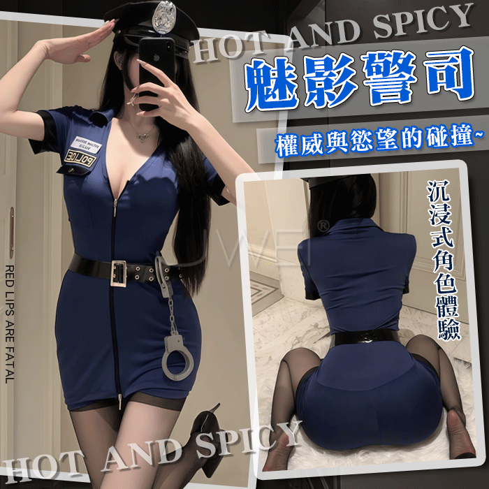 魅影警司.制惑拉鍊調節開胸性感貼身包臀女警套裝-藏藍色【連身褲裙+皮帶+手銬】