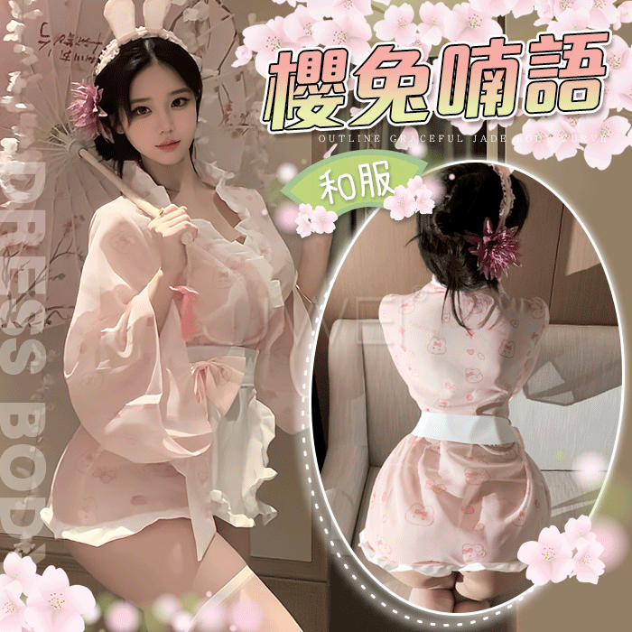 櫻兔喃語.糯糯小兔嘰薄紗開襟印花日式和服套裝【髮箍+和服+圍裙+T褲】