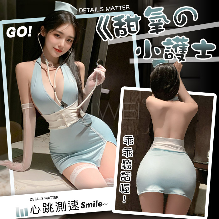 甜氧小護士.私人護士深V露溝微開衩包臀連身裙-藍色【帽子+洋裝+T褲】
