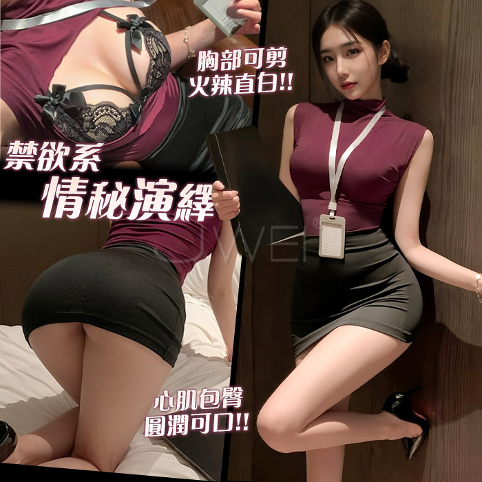 情秘演繹.胸部可剪緊身包臀禁慾系OL秘書套裝-紫+黑【上衣+工牌+包臀裙+內褲】