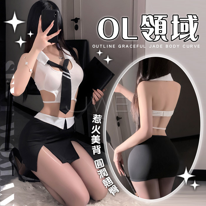 OL領域.挖空露腰美背撞色雙開衩包臀裙OL小秘制服套裝【上衣+領帶+包臀裙+內褲】
