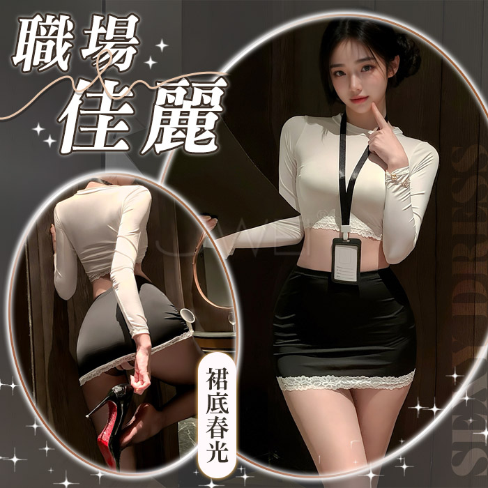 職場佳麗.撩撥暗慾腰腹雙邊蕾絲秘書套裝【上衣+工牌+包臀裙】