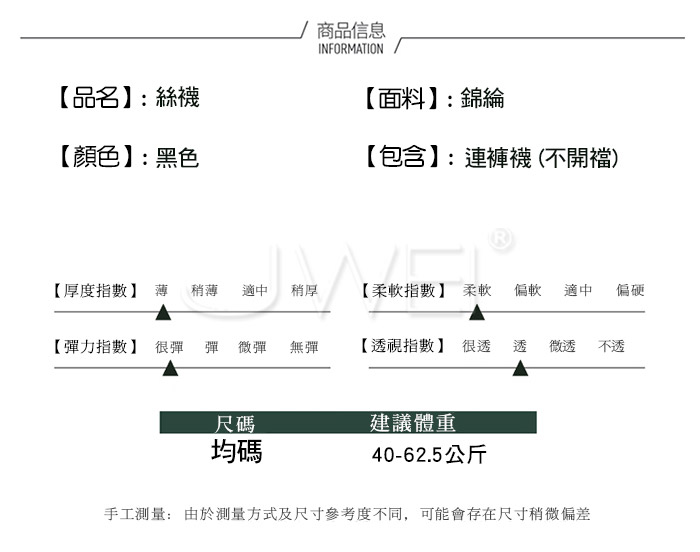 ■內容物:絲襪 ■適穿尺寸:FREESIZE ■彈性:有 ■未撐開平量尺寸正負誤差1~2cm,1吋=2.54cm ■注意事項:基於保障消費者個人衛生,此貼身衣物恕不接受退換貨。 (如為商品本身暇疵,接受七日內換貨,請勿試穿,謝謝您)