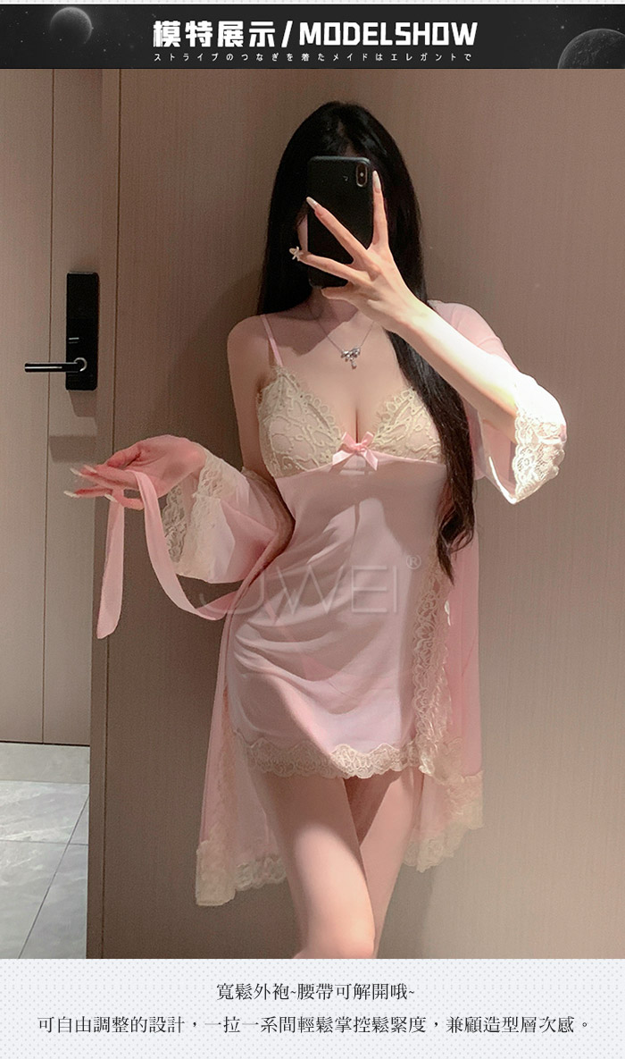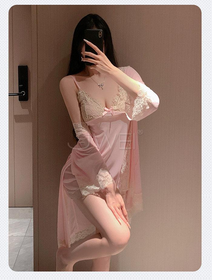 微醺蕾絲.性感深V露溝睫毛蕾絲覆胸美背睡裙-粉色【外袍+睡裙+T褲】