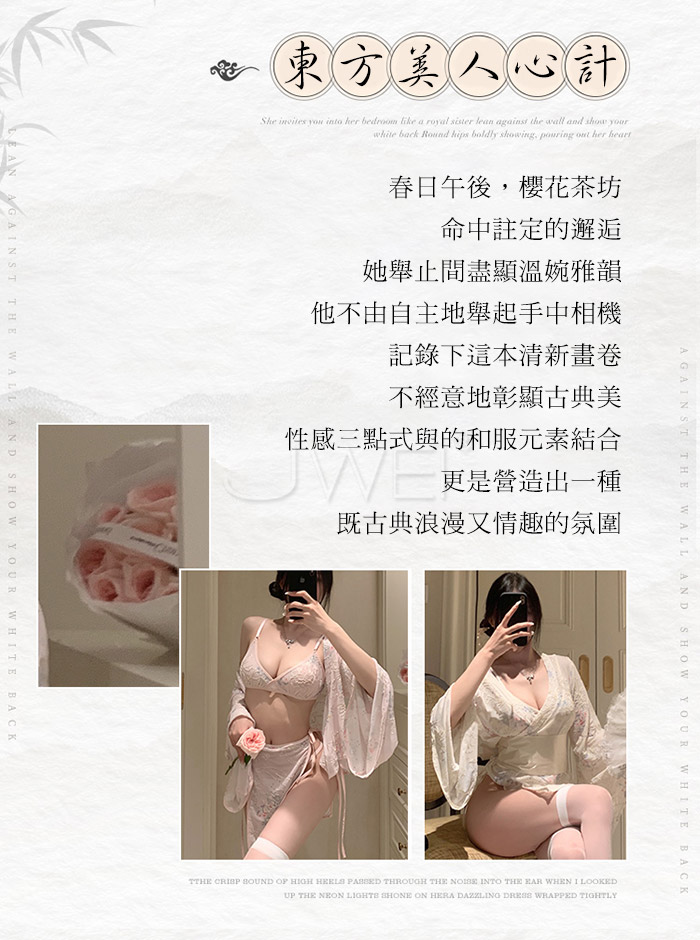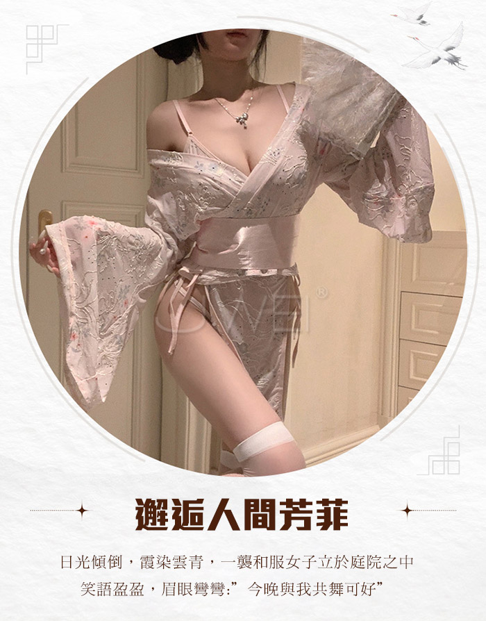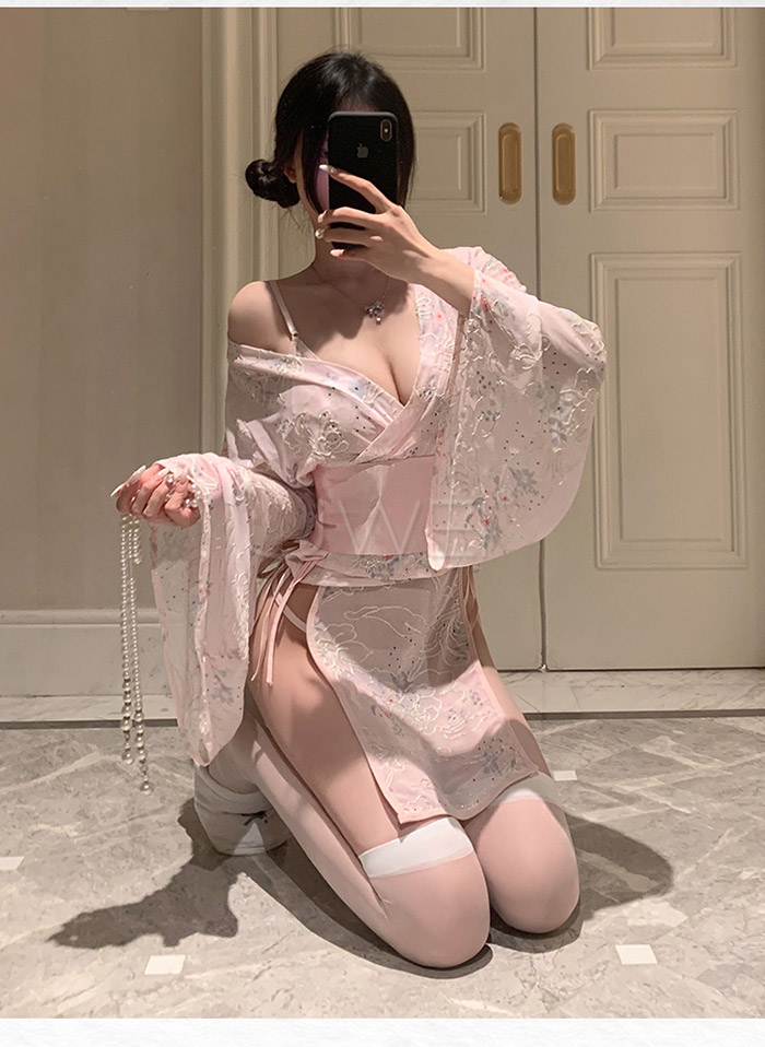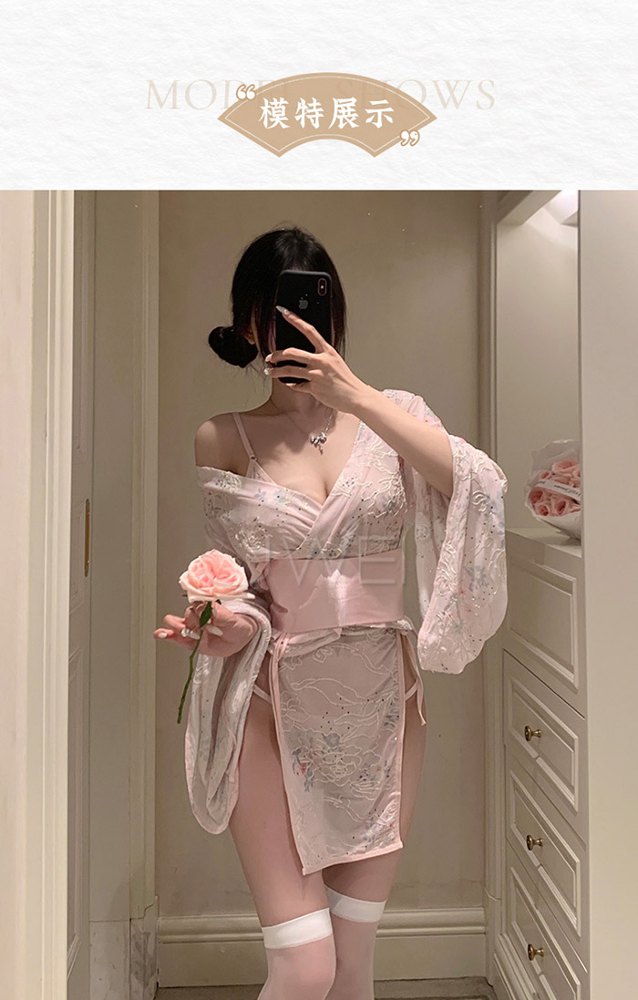 春日櫻花.風情開襟露胸微透日式和服套裝-粉色【外套+胸罩+T褲+腰封+分片裙*2】