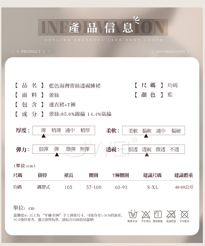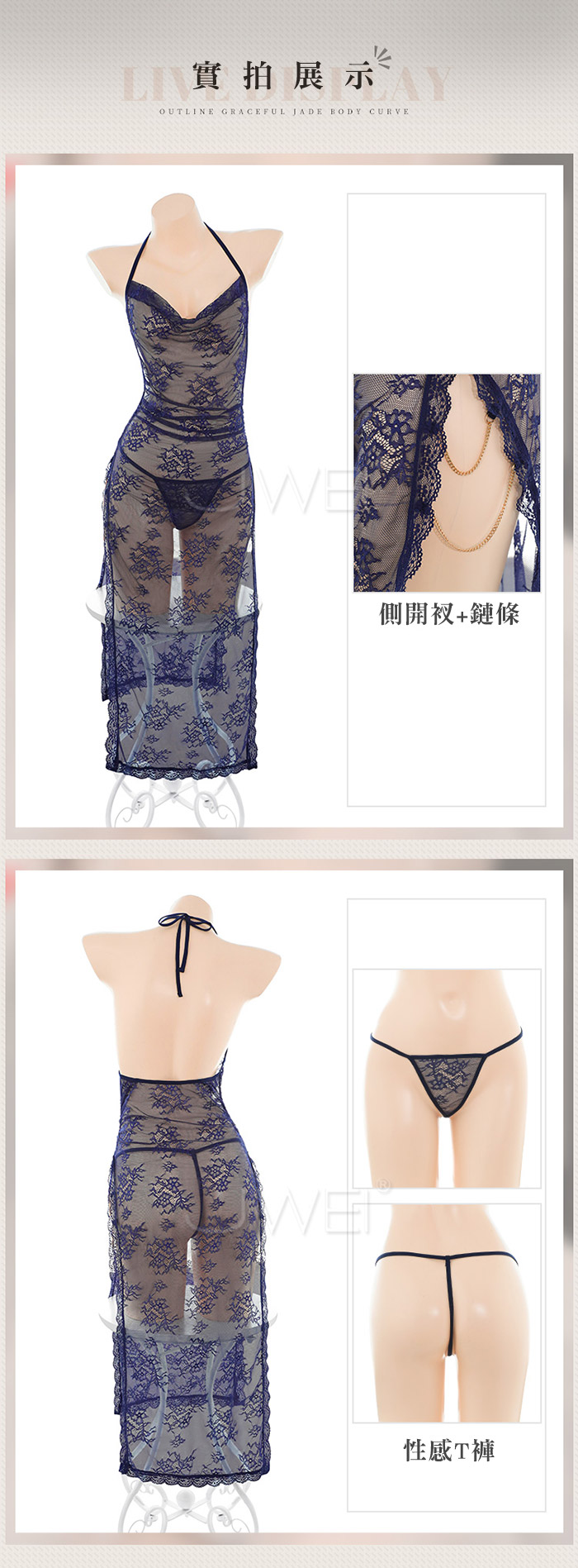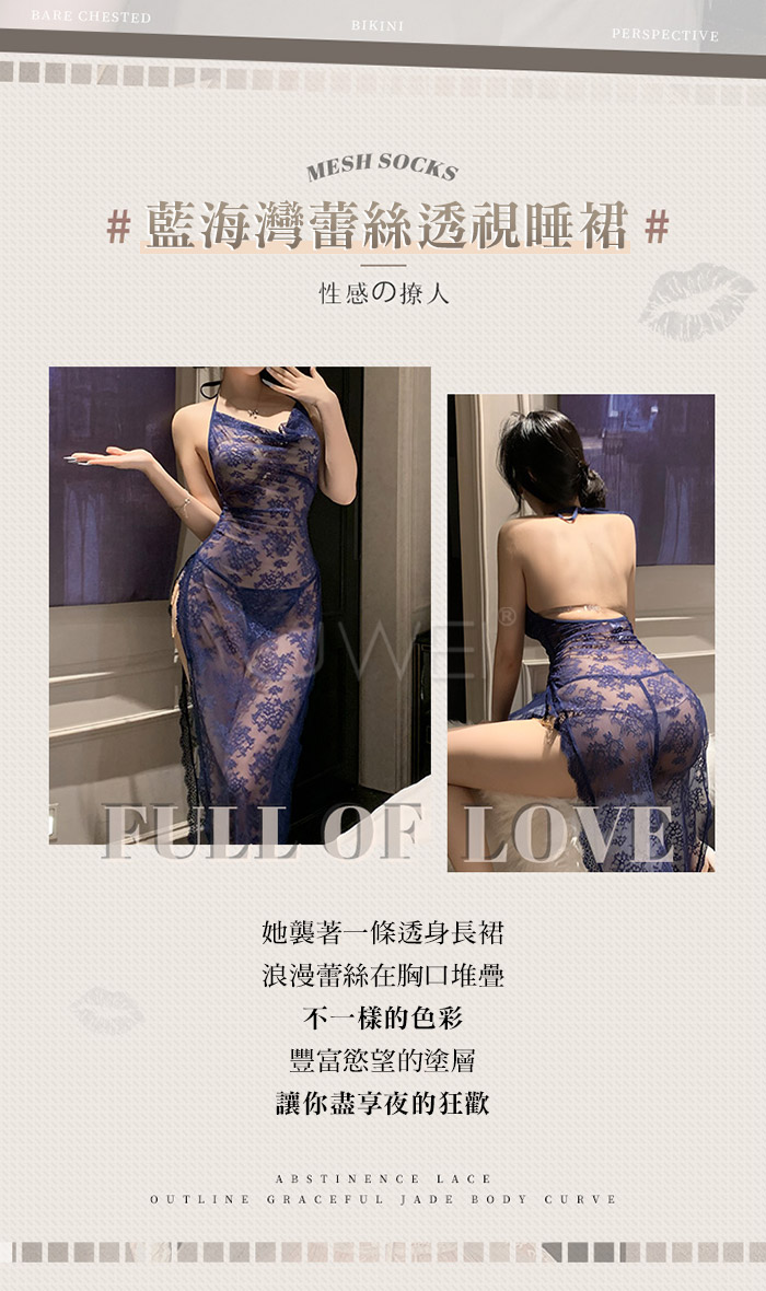 ►您現在的位置:首頁>柔媚御姐.藍海灣純欲蕾絲蕩領 美背半露兩側開衩透視睡裙【連衣裙+T褲】