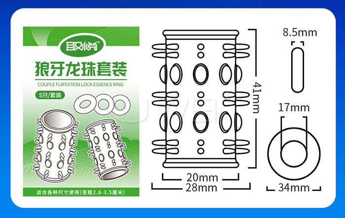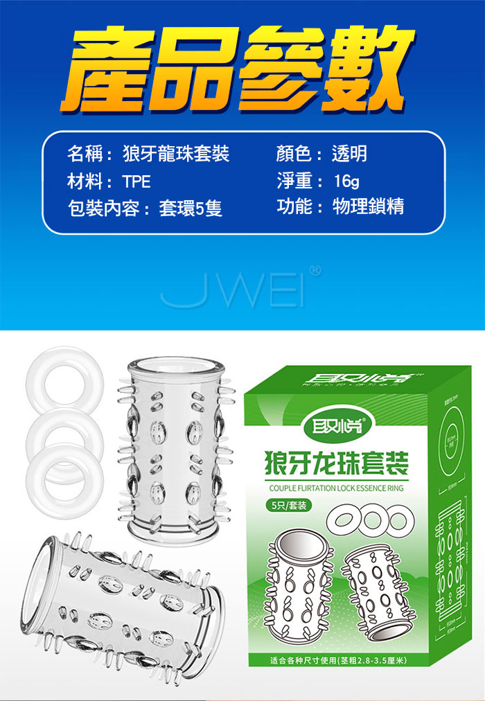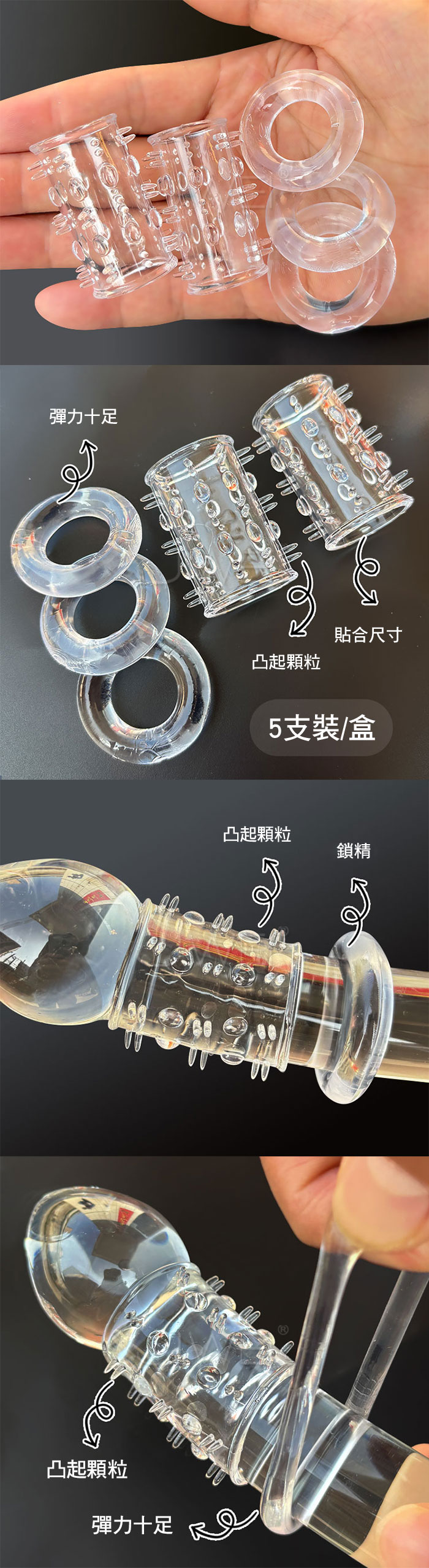 ►您現在的位置:首頁>取悅 狼牙龍珠.顆粒刺激降敏加時高彈鎖精套環【5入裝】
