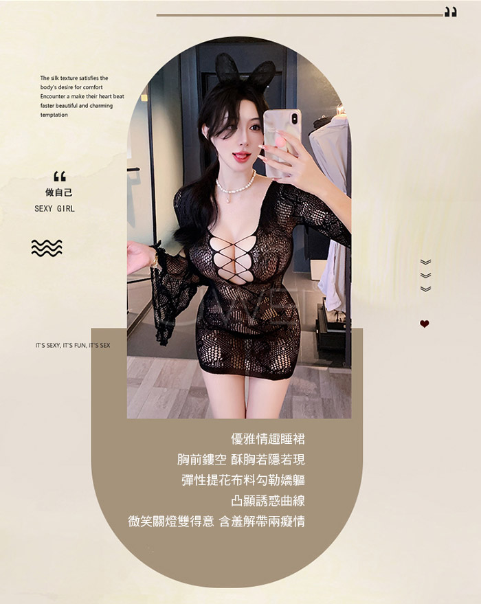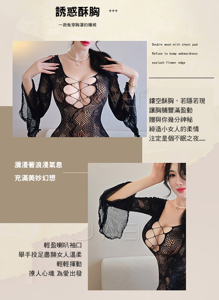 | 沐雅春風.鏤空美胸輕盈優雅喇叭袖口包臀網衣