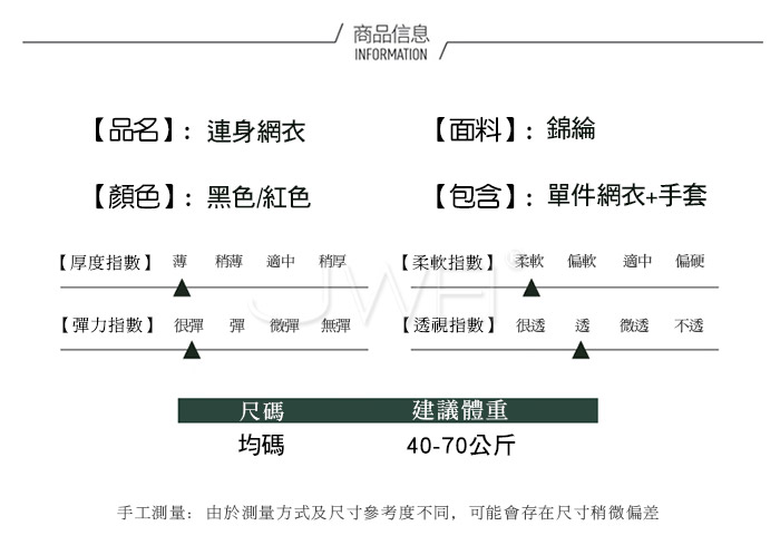 ■內容物:單件網衣+手套 ■適穿尺寸:FREESIZE ■彈性:有 ■未撐開平量尺寸正負誤差1~2cm,1吋=2.54cm ■注意事項:基於保障消費者個人衛生,此貼身衣物恕不接受退換貨。 (如為商品本身暇疵,接受七日內換貨,請勿試穿,謝謝您)