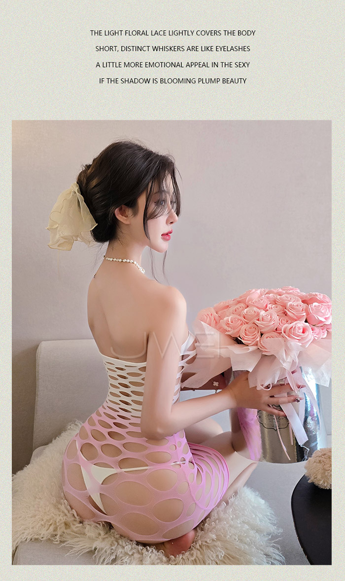 | 暗夜天使.漸變色一字領大網情趣連體性感貓裝【白漸粉】