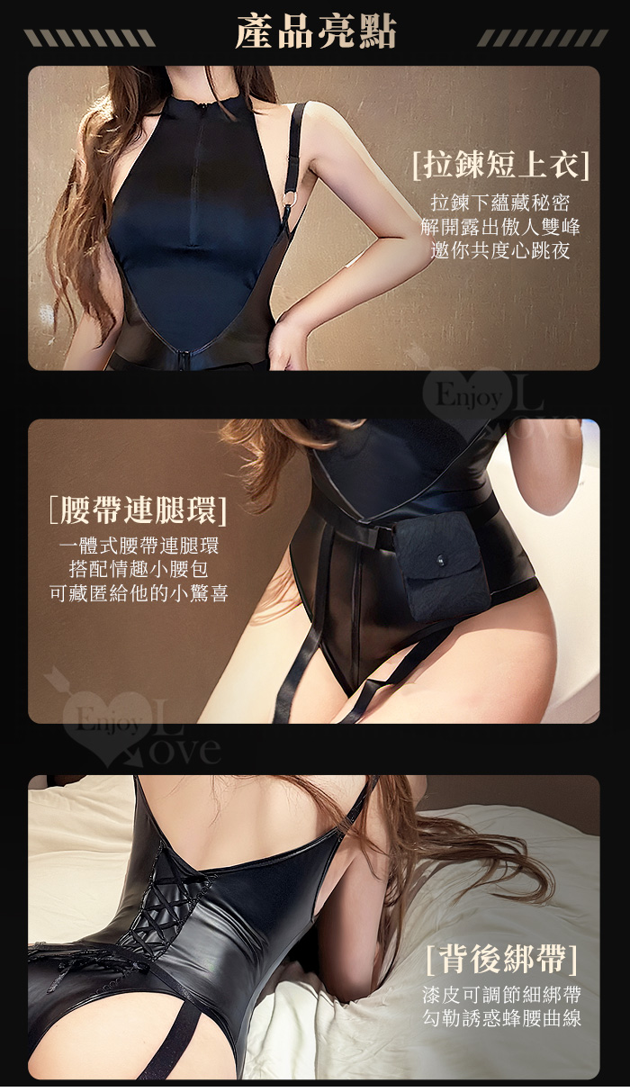 酷感削肩漆皮連身衣|拉鍊開合設計+可拆腰帶腿環四件式套裝