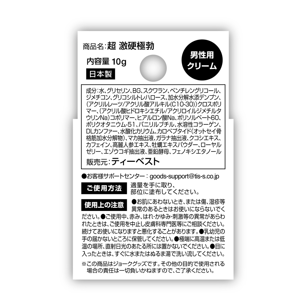 内容量:10g 人氣的男性助勃增硬軟霜!價格合理,但真的很給力! 男性用增強勃起力,硬度提升! 每次使用少量將會產生驚人的增硬增粗效果! 成份天然健康,各年齡男性均適用。 只需取適量塗在陰莖及龜頭位置便可増加充血和硬度提升, 勃起力更強烈! 性愛前3-5分鐘塗抹即可! 全天然成份,絕無副作用。 注意: 因個別人仕關係,效果因人而異。 日本製造