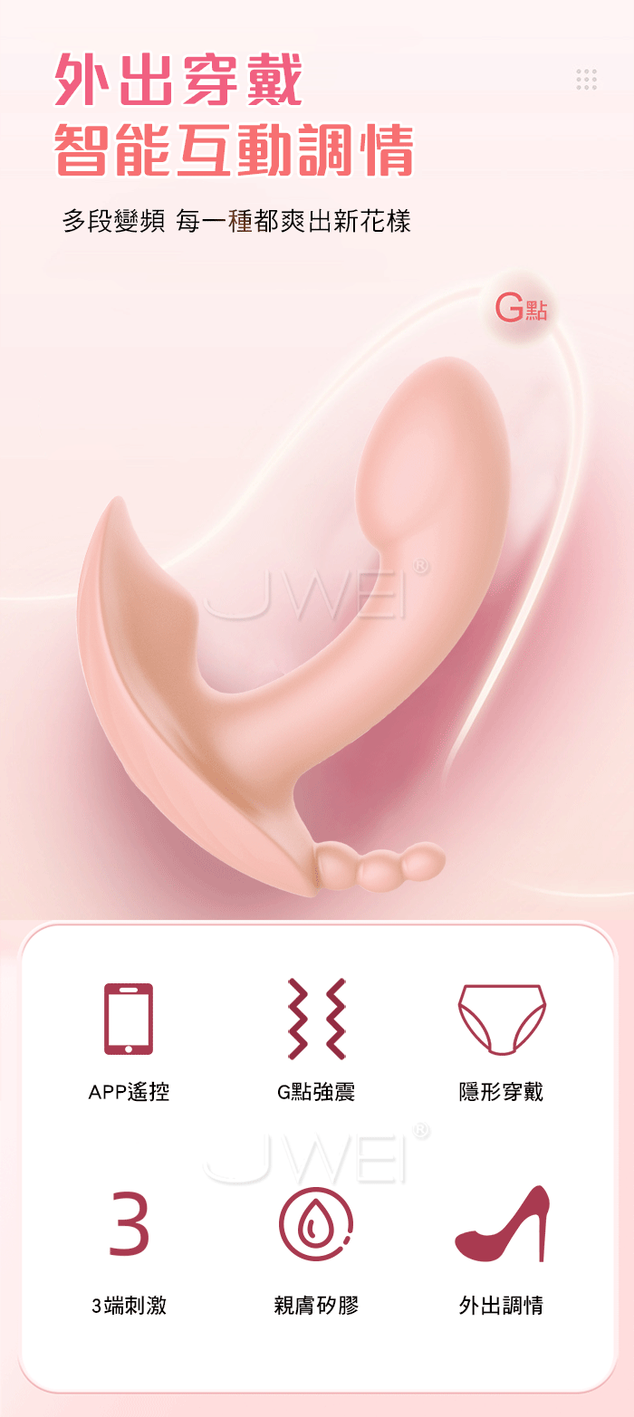 軟彈雙震,秒潮尖叫,全身水洗出玩多重愉悅前戲 外出穿戴,互動調情,多段變頻每一種都爽出新花樣 30種震動組合,從温柔挑逗到欲罷不能,雙頭均為3檔頻7檔變頻 產品規格 ■尺寸:大小詳如圖片標示 ■材質:矽膠 ■特點:10頻震動、APP智控