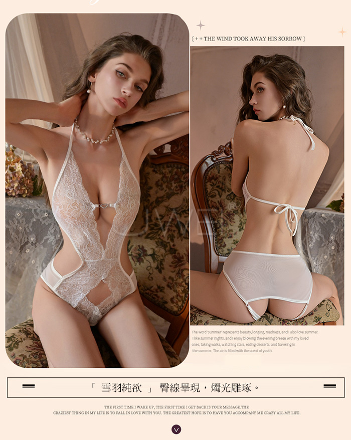 ►您現在的位置:首頁>繁花似錦.深V愛心鑽飾露胸掛脖繫帶美背蕾絲開襠連體衣【白色】