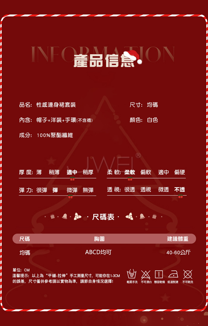 ■內容物:帽子+洋裝+手環 ■適穿尺寸:FREESIZE ■彈性:彈 ■未撐開平量尺寸正負誤差1~2cm,1吋=2.54cm ■注意事項:基於保障消費者個人衛生,此貼身衣物恕不接受退換貨。 (如為商品本身暇疵,接受七日內換貨,請勿試穿,謝謝您)