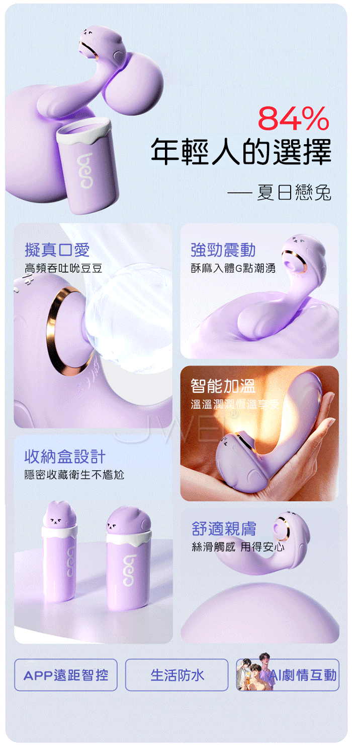夏日戀兔吮愛激震,挑逗全身愉悅點,智能高潮新花樣 仿真吮吸技術,入門級友善體感,採用空氣負壓技術模凝人體吮吸的真空狀態 減少機械猛吸帶來的壓力痛威,譲吸吮更柔和,更舒適 入體強震,順滑進入掀起潮湧,人體工學設計,亞洲女性初次使用也自如〜 產品規格 ■尺寸:大小詳如圖片標示 ■材質:ABS ■功能:9頻震動、9頻吮吸、APP智控、加溫
