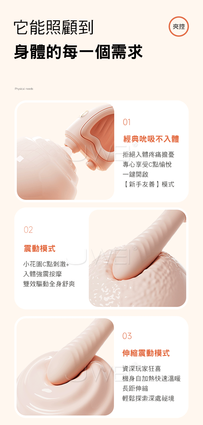 ►您現在的位置:首頁>夾控.5x5頻伸縮吮吸強震 夾腿感應智能遠控自慰按摩器【伸縮款】