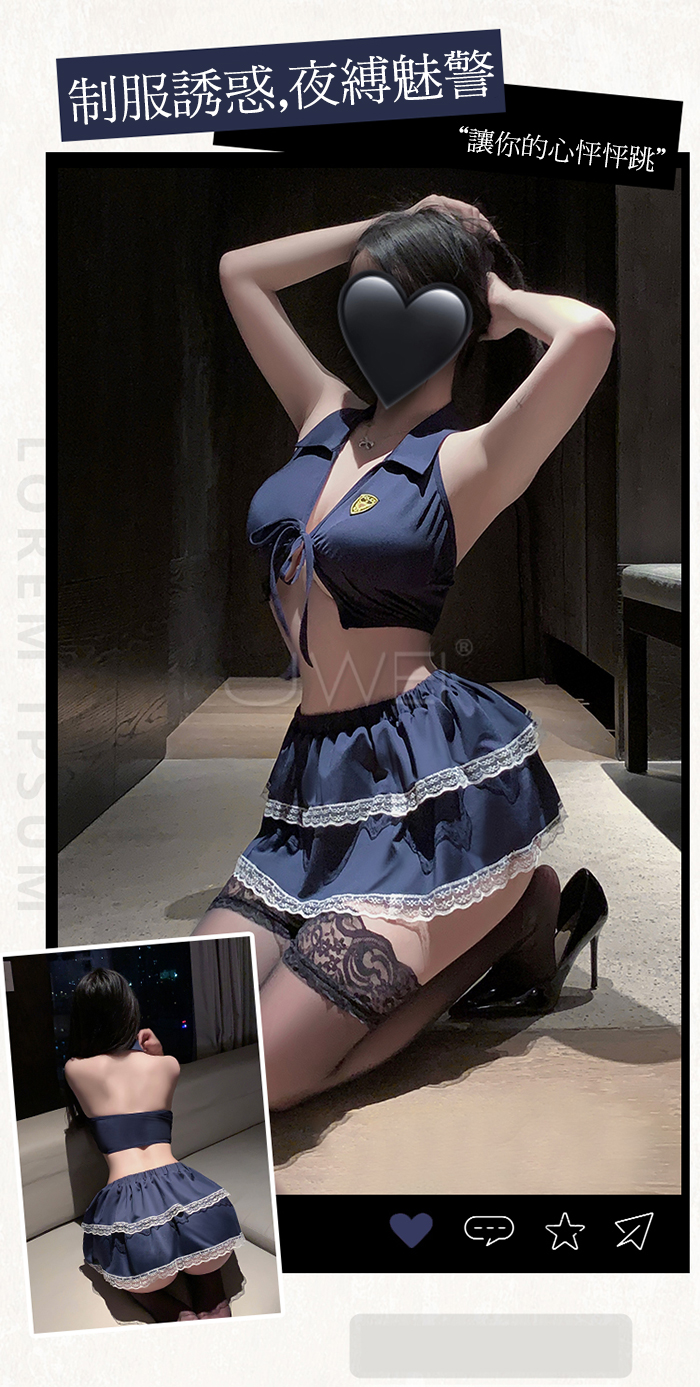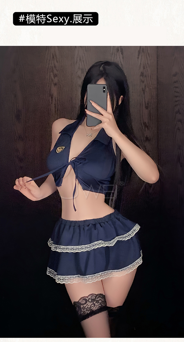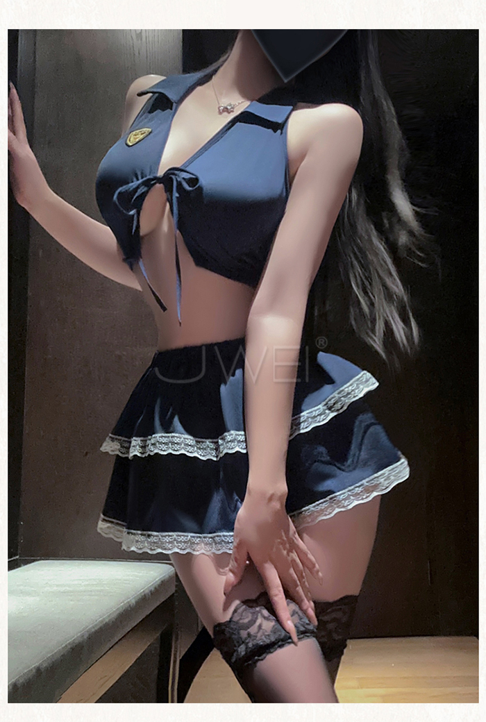►您現在的位置:首頁>夜縛魅警.玩味綁帶束胸露背雙層褶裙警花cos套裝【上衣+裙子+T褲】