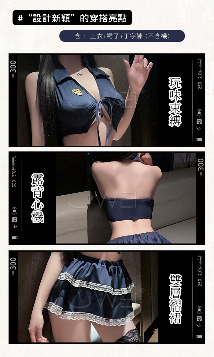 | 夜縛魅警.玩味綁帶束胸露背雙層褶裙警花cos套裝【上衣+裙子+T褲】